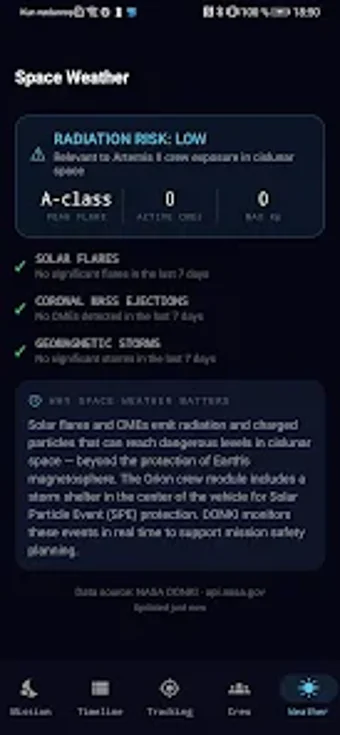 이 앱은 또한 발사까지의 정밀 카운트다운, 현재 미션 단계 업데이트 및 태양 플레어와 지자기 폭풍에 대한 경고를 포함한 실시간 우주 날씨 데이터를 제공하는 상세한 미션 대시보드를 제공합니다. 사용자는 포괄적인 10일 미션 타임라인, 바이오가 포함된 승무원 프로필 및 고급 기능을 위한 선택적 미션 제어 프리미엄 업그레이드에 접근할 수 있습니다. 모든 데이터는 공식 NASA API에서 제공되어 정확성과 신뢰성을 보장합니다.